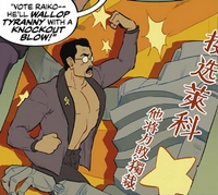 Following the defeat and subsequent arrest of Kuvira, President Raiko saw his popularity among the people of the United Republic plummet, as they regarded him as a coward who abandoned them during their time of need.[2] It became exceedingly common that people threw objects at him during any public appearance.[22] As such, he dedicated the majority of his time on his reelection campaign in an attempt to salvage his reputation, neglecting to visit the temporary refugee camp that had formed at the outskirts of Republic City. To that end, Wenyan, Raiko's campaign manager, had commissioned campaign posters featuring a triumphant Raiko defeating the Colossus with an uppercut and the slogan "vote Raiko—he will wallop tyranny with a knockout blow!" Raiko was not convinced, however, musing that the idea was misleading since it had been Korra who defeated Kuvira and not him, though he went along with the idea after Wenyan pointed out that it was imperative for his reputation that they projected an image of strength and fearlessness to offset the belief that he was a coward.