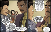Raiko controversially made comments about arrests at an Equalist student protest in Roku Park, claiming that only the poorest nonbending students appeared to be rounded up and arrested, and asserted this as proof of police corruption under President Moon. While the claims were unsubstantiated, the Equalist revival was happy to use them as fodder for more anger.[25]