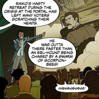 After having his picture taken a few times, Raiko brushed off Asami and Zhu Li's attempts to have a conversation with him and wanted to leave. Before he could, however, he was confronted by Avatar Korra, who warned him of another spirit crisis if he did not call off his military. Raiko refused and was quick to retort that he would not be having a crisis if Korra had not created the portal in the first place. Although Korra defended herself by pointing out that she had not done so on purpose but had to do something in order to save the city, Raiko placed emphasis on the fact that she destroyed entire neighborhoods by doing so, rendering all the refugees listening in on the conversation homeless. Raiko turned to the refugees, telling them that while Korra claimed to have their best interest at heart, she left them to return to a broken city to pick up the pieces while she went on a vacation. Finding support in the dismay of the refugees at Korra's address, Raiko turned back to Korra and blamed her recklessness and selfishness for shattering the lives of the refugees while he was "as usual" left to deal with the consequences. Although Asami and Tenzin were quick to defend Korra, the Avatar led her friends away from the president and the refugees.[3]