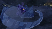 After Korra recovers, she enters the Avatar State, which catches the spirit's attention. The spirit makes its way toward Korra once more, who lifts herself into the air to dodge its attack, and firebends at it. Seemingly unaffected by the attack, the spirit grabs Korra with a tendril and brings her to the ground. As the spirit is about to deliver the final blow, it is suddenly put into a trance-like state when Unalaq encircles it with water. The spirit changes color and starts to glow, eventually disappearing.