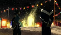 After dinner, Bolin, Mako, and Korra attend the festival. Mako and Korra are feeding each other cotton candy, which causes Bolin to feel uncomfortable. He tells Korra he is going to make a move on her cousin Eska, to which Korra retorts that she has always found the two rather creepy.