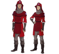 The Republic City firefighters form an official organization recruited from waterbenders that provides fire protection, technical rescue, and the primary response to fire hazards in Republic City. The firefighters typically wear distinctive carmine red and dark gray protective clothing as well as helmets. Operating in teams of four, the waterbenders have access to fire trucks to reach their destination, where they use their bending abilities to extinguish the fire. In doing so, the fire engines, hydrants, and water ponds around the city serve as sources for firefighting water. The Republic City firefighters also have their own logo, depicting a red flame that is to be extinguished by a blue wave.[19][40]