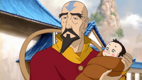 At six months old, Rohan traveled once again to the Southern Water Tribe with his family, this time for the Glacier Spirits Festival, and sat with his grandmother, Katara, during the Royal Feast.[5] After his father had been dismissed by Korra as her teacher, he left with his family for the Southern Air Temple for a vacation, arriving at the temple in a woven baby back carrier with his mother.[6] He was later watched over by his mother and Aunt Kya when his sister Ikki returned to the temple.[7] A few days later, he watched with the rest of his family as his brother directed an aerial display performed by the ring-tailed winged lemurs that lived at the temple.[8]