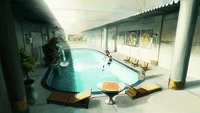 The interior of the mansion is elegantly decorated and beautiful. There is a swimming pool with a large lion turtle statue, as well as two gyms located on either side. There is also a racetrack located within the mansion's grounds, which, in addition to being used for sport, also serves as a test track for Satomobiles.
