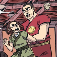 Jojan tells Suki to stop squirming, and states that he would likely become employee of the month for dealing with her appropriately. Suki tells Jojan one last time to get his hands off, and proceeds to flip him over when he refuses to comply. With his employee unconscious, San decides to deal with the situation himself and attacks Suki with firebending. Suki responds by dodging the firebender's attacks and blocking his chi before leaving the store. Sokka follows behind, noting that some of the shells were lit on fire during the confrontation. Horrified, San wakes Jojan and orders him to get buckets of water to put out the flames.