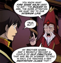After the Hundred Year War, Shyu was released from prison and became the new Great Sage as well as the leader of the High Temple. Over the course of the next two years, Shyu headed the reformation of the Fire Sages and revived several old traditions. He also became well acquainted with Fire Lord Zuko, who visited the temple occasionally to study scrolls and murals in the catacombs. During these visits, Shyu offered the Fire Lord a place in his meditation classes, although the latter always politely declined.