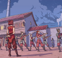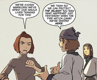 Suki was inspired by Aang coming back to help people, and stated that helping others should be the job of the Kyoshi Warriors, and not just the Avatar. Suki stated that they had spent their whole lives training to help others, but Jie stated that they were needed on the island to defend it. Declaring that they were also needed in the rest of the world, Suki stated her intention to leave the island, believing Kyoshi would be understanding. She did not order anyone to come and believed that some of the Kyoshi Warriors should stay behind to protect the island, but offered anyone who wanted to come to do so. Jie still refused to agree to this plan, but many other Warriors voiced their support.[4] Those who agreed to join Suki included Aika, Fume, Mira, and Rie.[19]