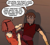 As she entered her cramped solitary cell, Suki assured herself that she was not alone. She was released after two weeks and talked to her allies, who informed her that Biyu had been removed from the general population and had been given a special cell and certain privileges. Suki grew angry and rhetorically asked what Biyu had said to gain such privileges, to which nobody replied. Spotting Biyu heading back to the cell, she scaled the walls of the prison and rushed inside, knocking Biyu to the floor and declaring her a traitor. Biyu did not deny doing so, noting that she had to look out for herself. Suki asked about the others and the plan to build up their strength to escape; Biyu responded that the plan was not hers, and although she thought that the plan was smart, she realized she did not need to be in such danger after the fight in the cafeteria. Suki angrily stated that Biyu had betrayed her fellow prisoners to the Fire Nation after they tried to stand up to them, and asked Biyu if she had any loyalty. Biyu said that, unlike Suki, she did not care about community, and only needed to get through her sentence in as much comfort as possible, saying that she would choose the warden over Suki as he owned the prison. Biyu chided Suki for believing that they were friends; in her anger, Suki lurched toward Biyu and threatened to throw her over the railing. As Biyu began to panic and apologize, Suki threw her back onto the floor and walked away, while Biyu taunted her for being a coward if she just wanted to scare her.[4]