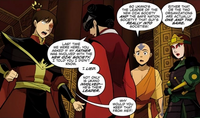 On the following day, Suki took part in a meeting at the throne room where she revealed to Mai that Kiyi's kidnapper had used ligthning. Mai consequently revealed that her father Ukano had led the New Ozai Society. Based on this information, Suki speculated that the Safe Nation Society might be a mere rebranding of the New Ozai Society. Zuko and Aang then began to argue about the right course of action, culminating in the Fire Lord ordering the Avatar out of his sight. Suki and Ty Lee escorted Aang out of the throne room. Thinking about Sokka would do in this situation, the Kyoshi Warrior leader then proposed to investigate the palace for clues about Azula's team. After some fruitless searching in Kiyi's room, Ty Lee remembered that the palace had secret passageways, showing one of them to Suki and Aang. the three promptly traveled to the Capital City Prison where they tried to inform Zuko of their findings. When the Fire Lord refused to listen, Aang basically abducted him, causing Suki and her friends to storm after the pair.[34]