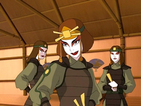 Suki was brought back to a Fire Nation encampment, where Azula discovered Suki's status as leader of the Kyoshi Warriors, as well as her relationship with Sokka. It was decided that Suki would be separated from the rest of the Warriors and sent to the Fire Nation's highest security prison, the Boiling Rock. Shortly before her departure, she was taunted by the Fire Nation princess, who entertained the notion of having Sokka come save her so that she could capture him as well. Azula reminded Suki that she wanted her to know just how hard Fire Nation prison would be, and reminded her that she had been reduced from the leader of a respected group of warriors to a mere prisoner. Suki stood her ground without giving Azula any response, leading the princess to claim that she was doing everything for her "favorite prisoner" and that she would destroy the Avatar and his friends while Suki stayed in prison.[4] Meanwhile, Azula, Mai, and Ty Lee disguised themselves with the Kyoshi Warriors' uniforms to infiltrate the Earth King's palace after their defeat.[24]