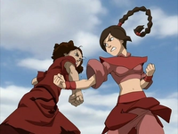 Suki was found by Sokka, who had initially sneaked in along with Zuko in the hopes of finding his father.[6] Although she initially knocked him down, thinking he was a Fire Nation guard due to his outfit, she happily reunited with him after he revealed his true identity and declared that she, contrary to Azula's claims, had never given up on hopes of rescue. After an awkward official introduction with Zuko, during which he apologized for burning down her village, Suki readily joined the breakout plans. When Sokka decided to remain behind in hopes of finding his father, she chose to stay behind with him, risking imprisonment again. When the group started a riot to cover their escape, Suki quickly captured the prison warden. When Azula and Ty Lee attacked the group on the prison gondolas, Suki joined Sokka and Zuko on the roof of their gondola in an attempt to defend it. Calling it "a rematch [she had] been waiting for", she clashed with Ty Lee in an even duel. When the cable carrying their gondola was about to be cut through, Azula and Ty Lee retreated, though due to Mai's intervention, Suki and the others managed to safely reach the station at the end of the cable and escape on Azula's airship to the Western Air Temple.[7]