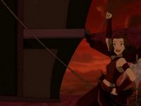 Suki went on to manipulate the rudder of the airship she had fallen onto, thereby taking control of the entire vessel. Noticing Toph and Sokka hanging helplessly from another airship, she saved the two by steering her captured aircraft into the other vessel. After Aang had removed Ozai's firebending, the reunited group landed the captured airship and began to taunt the fallen tyrant. Suki also made a lame attempt to do so, earning Toph's criticism of her, "Leave the nicknames to us, honey."[8]
