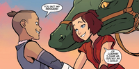 As Aang, Katara, Sokka, and Toph traveled to meet Suki in Yu Dao, they became involved in Cranefish Town's conflict between benders and nonbenders. Sokka accepted that Team Avatar would not be leaving the town for a while and sent a dragon hawk to invite Suki to join them.[12] Suki borrowed an eel hound to travel to Cranefish Town, where she met Team Avatar outside the Earthen Fire Refinery and lovingly embraced Sokka.[35]