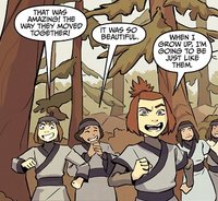 As she was the eldest Kyoshi Warrior of her village, Suki was in charge of training the younger warriors.[3] She eventually rose to lead her village's team.[1][3][13][4]