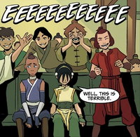 Sokka and Suki visited Toph's larger and more expansive Beifong Metalbending Academy in the months after General Old Iron's assault on the Earthen Fire Refinery. Suki was impressed at the changes Toph had made to her academy, though expressed concern when seeing how dispassionate Toph was about teaching. Toph explained to the couple that she was bored from the monotonous routine of teaching every day, and Suki told her that they would shake up her routine. Toph was excited to go on an adventure, but to her disappointment, Suki told her that they were going to a concert in the town. Although Toph was skeptical about the band, Sokka explained that Team Avatar had met Chong, Lily, and Moku before Toph joined them. Suki explained that they got front row seats, starstruck to see Trustfully in Love perform. She was certain that the experience would shake off Toph's everyday problems. Suki began to cheer as the band started to perform and was still dancing to their songs three hours later, but at that point, Toph expressed that she had had enough, and left the concert hall.[32]