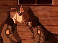 Later, while working at the terminal, she encountered Team Avatar once more. Suki approached Sokka, aggressively asking to see their tickets and passports. After a heated exchange, she kissed Sokka, which made him realize who she was. When Aang decided to escort a group of stranded travelers through the Serpent's Pass, Suki accompanied them to ensure that they made it through safely, which concerned Sokka. Suki rescued Toph at one point, saving her from drowning. Toph proceeded to kiss Suki on the cheek, thinking that it was Sokka who saved her; when Suki awkwardly revealed that it was her, the highly embarrassed earthbender only half-jokingly told her to let her drown. It was during the night that her feelings for Sokka were made more clear,[21] though he was reluctant to jump into a relationship with her due to his inability to stop Princess Yue giving her life to save the Moon Spirit during the Siege of the North.[21][22] At one point during the night, Suki went to kiss him, but Sokka was reluctant to do so under the moon, as it reminded him of Yue, and put Suki off without an explanation. Before her departure, she apologized to him, telling him she had acted rashly, but Sokka stopped her, and immediately made up for the previous night by kissing her back. The two began dating thereafter.[21]