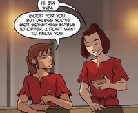 - At the start of the comic, Azula tries to taunt Suki by referencing her relationship with Sokka. However, in the animated show, she only learned of Suki's relationship in the episode "The Crossroads of Destiny", long after the interaction as portrayed in the comic.[12]
