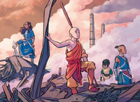 Upon returning to the Fire Nation Capital, Zuko faced a rebellion by the New Ozai Society, an underground, nationalistic movement. Aided by Suki and several other allies, the Fire Lord was able to suppress the insurgency, although its leader Ukano escaped.[58] Meanwhile, Aang –accompanied by Katara, Sokka, Toph, and some Air Acolytes– tried to revive the ancient Yangchen's Festival due to a vision had had received in Yu Dao. The group discovered that the festival's sacred grounds had been built over by a small industrial settlement, Cranefish Town, surrounding the Earthen Fire Refinery.[59] To the group's surprise, the refinery was co-owned by Toph's estranged father, Lao Beifong, resulting in a tense but gradual rapprochement between the two.[60][61]
