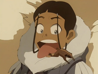 A feverish Sokka asks an equally ill Katara for water again, to which she assures him that Momo should return soon. When the winged lemur returns, however, he did not fill the water skin, though brought them a dead mouse, which he drops on Katara's chest, much to her disgust. Katara pleads with him again for water and Momo departs, leaving Katara to wonder what is keeping Aang.