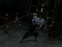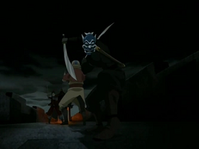 While Aang and the masked figure are scaling the wall via a rope that the stranger left there earlier, an alarm is set off, which draws attention to their attempt to climb the wall. A guard atop the wall promptly cuts the rope, sending them tumbling down. At the last second, Aang breaks their fall with airbending, securing a safe landing. The masked figure, unsheathing his swords, points to the open gates and they make a run for them, but Zhao appears on the balcony, bellowing that the Avatar has escaped and orders all the gates to be closed immediately. Aang, running past the stranger and telling him to remain close to him, uses his airbending to clear away several guards blocking their path. Aang smoothly runs through the closing doors, though the masked figure is forced to stop and defend himself as several guards surround and assault him. Aang realizes that the stranger is no longer following him and takes the spear from a guard attacking him, breaks off the sharp spearhead, and utilizes the stick as a staff. He promptly charges the soldiers attacking the masked figure and uses his airbending to incapacitate them. Wasting no time, he hurls the stranger atop the first of the fortress walls, where more soldiers immediately swarm him.