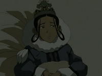 Back with Katara and Sokka, Momo has brought many items to Katara, ranging from fans to pottery to jewelry. His latest addition is a tiara, which he places on Katara's head. With a voice weak from her illness, she reiterates that they desire water. Giving up on Momo, she rolls around and pleads for Aang's swift return. Completely delusional, Sokka asks Katara who the "Aang kid" of whom she speaks is, while referring to her as "Your Highness", much to her annoyance.