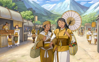 After several years, the islanders managed to rebuild homes and cultivate a local food supply, while also starting to plant tea and golden jasmine once more. Trade began to pick up once again, with the war's end meaning that traders began to view the island as a safe hub. Outsiders had money to spend on pre-war comforts like the golden jasmine flower, which was viewed as a symbol that the world was being set right once again.[21] Regardless, "The Devastation" left a lasting impact on the island, with the island's traditional culture of hospitality being particularly affected.[22] For instance, Fire Lord Zuko offered aid in the reconstruction efforts, though the islanders rejected his aid in fear until Zuko himself came to the island to convince them of his intentions. Meanwhile, companies such as the Jing Hua Tea Consortium took a new interest in the island, with the company's chief officer, Yuka, even offering to buy the entire island.[23]
