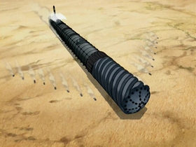 Several Fire Nation tundra tanks rumble across the rugged terrain toward the Outer Wall of Ba Sing Se, the enormous Fire Nation drill following close behind. Several segments of the drill extend forward, elongating the machine. Steam is released from its pipes and metal spikes lodge into the surrounding land.