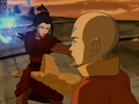 Working on his "X", Aang momentarily stops for a break and wishes he was a metalbender. Momo suddenly shrieks, causing him to turn around and catch sight of a blue fire blast coming toward them. Aang manages to dodge it and sends Momo away, preparing for a duel with Azula. Azula shoots several fireballs at him, all of which Aang manages to avoid. He blasts a gust of air her way and uses water whips to deter Azula's blasts off-target. Aang attempts to deflect two fierce blasts she shoots with a water shield, however, the shield evaporates and he is sent back several feet. More boulders are hurdled downward and Aang takes the opportunity to throw one at Azula. She ducks in time and shoots another fireball. Aang resorts to creating a wall of rubble and repeatedly hurls components of the wall at the Fire Nation princess, who merely kicks the boulders away and almost strikes Aang with a kick of flames. Azula proceeds to somersault in the air and deliver a powerful fire blast, destroying the makeshift wall and causing Aang to hurtle into the Outer Wall, falling unconscious onto the surface of the drill.