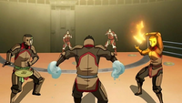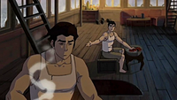 The Fire Ferrets are practicing together before the start of the tournament in the Pro-bending Arena's gym by barraging each other with their respective elements to test their reaction times. Their skills matched, they are all knocked down by one another simultaneously, much to their amusement. The team utters their pleasure in being able to practice again together, causing Bolin to point out that Korra joined their team before she entered the task force. They huddle together for a pre-tournament inspirational talk from Mako. Just as they exclaim that they are ready to win the tournament, Asami contradicts them, pointing out that they would need the new team uniforms with the Future Industries logo in order to be completely ready. Mako greets her lovingly, the two rubbing their noses together. Korra cringes at this in disgust, but regains her composure before anyone notices, and gives a friendly wave off to the couple as they leave for their lunch date. Being the only two remaining in the gym, Bolin emphasizes to Korra that they are currently alone together in an attempt to get closer romantically to her. However, she quickly leaves with the excuse of airbending practice with Tenzin, much to his disappointment.
