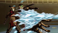 • When the Mo Ce Mongoose Lizards were knocked off the playing field, the waterbending player is seen being helped out of the water while two of his teammates are being carried off on stretchers. The close-up of one of the players on the stretchers reveals him to be a waterbending player as well.