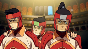 While the Wolfbats fight it out in the ring, Asami enters the room to congratulate them, and Korra thanks her and her father for their sponsorship and the ensuing chance to play in the tournament at all. As Bolin writhes in pain, asking for medical attention, Korra comes to his aid. As she touches his injury, he screams out in pain again, jokingly stating that Korra has hurt him enough already. Korra laughs it off and mentions that she had been taught the art of healing by Katara, and proceeds to take care of his injury. Reluctant at first, Bolin settles in the soothing feeling Korra's healing powers bring with them, and he listens to her apology for hurting his feelings. As they just cleared the air between them, Shiro announces the end of the match, declaring the Wolfbats to be the winners with a brutal first-round knockout. Korra and the rest of the team are shocked by the quick knockout and the sight of the opposing team members who are all seriously injured and are lifted from the ring by paramedics.