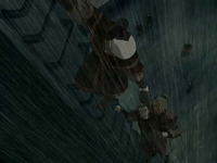 On Zuko's ship, everyone has made it to the bow and Zuko wonders where they were hit. Iroh directs their attention to the crow's nest, where the helmsman is hanging on for dear life. Zuko and Jee waste no time climbing the ladder to save him, despite the ship being dangerously rocked back and forth. Meanwhile, another lightning snakes down toward the metal ship, though Iroh intercepts it and redirects it away from their vessel and into the water, the encounter leaving him smoking. Unable to hold on, the helmsman plummets down, screaming. He is saved, however, by Zuko, who grabs a hold of his hand as he passes him by and lowers him to Jee, who supports the man to safety; the prince and the lieutenant look at each other with a small smile of respect.