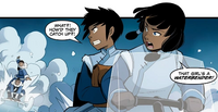 The duo later appeared as part of an exchange between the Team Avatar and the nationalists between Southern Chief Hakoda and Earth King Kuei. As the trade began, they, along with their master, chi-blocked Toph, Sokka, Katara, Aang, and Zuko. After Gilak attempted to cut the Bridge of No Return, the two siblings were incapacitated by Katara and Toph, who revealed that they, alongside the rest of Team Avatar, had wore chain mail armor, thus negating the effects of chi-blocking. After their leader's death, they were presumably imprisoned once again.[3]
