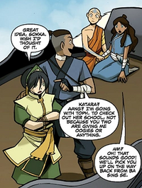 When Toph had to return from the group to her school as she had promised her students, Sokka complained that without her being present the "oogies" he was getting from Katara and Aang's romantic displays would only get worse. With an odd look on her face, Toph suggested Sokka to come along with her in order to avoid this, an idea he promptly jumped on as if it were his own. After Sokka explained his plans to his sister and her boyfriend, Toph took him by the hand and jumped off Appa without waiting for the bison to land, which caused Sokka to freak out, especially when Toph had to let go of him in order to create the earth-slide which was to cushion their fall. Once they were standing on solid ground, Sokka asked Toph where she had come up with the idea for her metalbending academy; however, when she waxed enthusiastic about how she felt she had made a difference by teaching Aang and how this had led her to feel in her heart that becoming a metalbending teacher was her life's calling, Sokka promptly dismissed this as a cover for her taking on the role simply because she liked telling other people what to do, to which Toph actually agreed. Soon after they arrived at the school, Sokka partnered up with Toph on an adventure once again, helping her prepare her students to defend her metalbending school against a rival class of firebenders.[13]