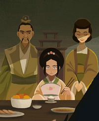 The lack of freedom her parents gave her led to Toph's parenting style becoming a total opposite of theirs, giving her two daughters, Lin and Suyin, total freedom in their life.[5] By 141 AG, Toph had fully reconciled with her parents, so much so that they were willing to let Suyin stay with them to avoid their granddaughter going to jail.[3]