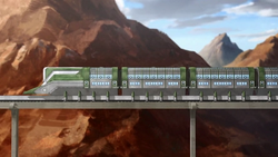 - High-speed maglev train - A train used by the Earth Empire as a mobile headquarters during their reunification of the Earth Kingdom. Designed by Varrick,[6] the train incorporated the inventor's electromagnetic technology, allowing the vehicle to propel itself along a single-line, monorail track, rather than using conventional rail tracks and train wheels; the track itself was comprised of two metal beams bolted to a series of concrete slabs.[7] The maglev train had several specialized compartments, including a lounge area for Kuvira and her inner circle, a research and development laboratory, holding cells for Earth Empire prisoners, and a storage space for the train's complement of mecha suits.[4][8][9]