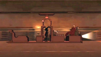 While searching for Avatar Korra in the underground Equalist headquarters, Team Avatar secretly boarded a tram and rode it into a prison, where they thought Korra was being held captive. However, they failed to find her and were forced to flee the headquarters. They once again boarded the tram and left for the exit but were pursued by several Equalists in a tram behind them. Bolin used earthbending to create a barrier to block their pursuers. Noticing the exit was heavily guarded, Lin Beifong bent a hole in the ceiling and used the collapsed overhead tramway rail as a ramp to launch their tram upward into another tunnel, allowing them to escape.[2]