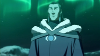 Unalaq was a waterbending master, the chief of the Northern and Southern Water Tribes,[4] a former member of the Red Lotus, and the first and only Dark Avatar. He was the younger brother of Tonraq, husband of Malina, with whom he fathered Desna and Eska, and uncle of Avatar Korra. A particularly spiritual man, he briefly served as Korra's spiritual mentor until her discovery of his involvement in her father's banishment, at which point he was absolved as her teacher and shunned.[6] Unbeknownst to anyone, Unalaq was working to release Vaatu from incarceration in the Spirit World, and succeeded in this task before fusing with Vaatu to become the Dark Avatar. To this end, Unalaq nearly destroyed Republic City before being defeated and killed by his niece. Even though his attempt to destroy the Avatar and usher the world into an era of darkness was consequently thwarted, Unalaq succeeded in reuniting humans and spirits and thus changing the world forever.[7]