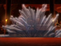 Water ring: A skilled waterbender can create a ring of water around their body which can be used for both defense and offense, such as shooting ice shards or sending water whips at their opponent. Pakku used this technique in his duel with Katara, and Kya used it in her duel with Zaheer[10] and twice against Ming-Hua.[12]
