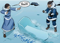 Slip over ice:[6] With a sufficient amount of water available, a skilled waterbender can cover a large area of the ground with ice, trapping their enemies' feet in ice while allowing them to slide around. The size and length are all determined by a waterbender's control, and more powerful benders can create larger floors. This technique was used by Katara while fighting the giant sea serpent[35] and by Pakku during the Order of the White Lotus' liberation of Ba Sing Se.[36] Tahno used a variation of this technique to only momentarily freeze the floor locally in order to cause Bolin to slip during a pro-bending match. Korra has also used this technique.[37] One of the Red Monsoon Triad members used the move to freeze the street,[31] and it has also been performed by Ahnah during a fight against an Earth Empire mecha suit.[38]