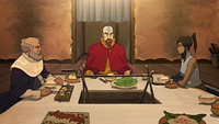 That night, Tenzin, Korra, and the White Lotus leader are having dinner. The Avatar repeatedly asks when her airbending training will commence, but the airbender states that he has responsibilities in Republic City as one of its leaders, where the situation is very unstable. Korra suggests returning to Republic City with him to learn the art there, though the White Lotus leader refuses, emphasizing that the city is too hazardous for her and they need to keep her safe while she completes her training as per Aang's instructions. Displeased, Korra subsequently leaves the room.