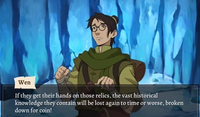 After some time, a group of adventurers encountered Wen in the ice cave system by chance. Wen explained the situation at hand, and expressed their worry that the vast historical knowledge in the labyrinth would be lost to time once again, or broken down for coin. They urged the adventurers to return the relics so that they could bring them to the university to study, promising them great rewards.