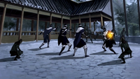 During the Equalists' attack on the air temple, the White Lotus sentries witnessed the arrival of the Equalist airships from their elevated quarters and rushed toward the main courtyard to confront the Equalist raiders. They launched a barrage of firebending, earthbending, and waterbending attacks, and, with the help of Lin Beifong and Tenzin's children, eventually defeated the invaders. On orders from the former Chief of Police, they locked the captured Equalists up in the temple's basement. The tides quickly changed, however, when more airships made their way over from the mainland and deployed more Equalists on the island, prompting the residents to prepare for a quick departure. To allow Avatar Korra and her friends enough time to escape the island, four sentries remained behind to thwart and delay any possible pursuit of the Avatar by Equalists forces.[1]