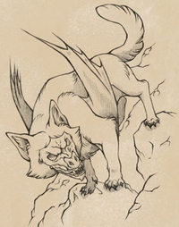 The wolfbat is the size of a wolf and generally resembles the canine, except for its bat-like wings and face. It is brown in coloration, quadrupedal, and possesses a set of webbed wings that it uses to fly. It has sharp, pointed teeth and a snout that resembles that of a hog's.[2][3]