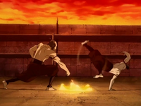 When he dueled with Prince Zuko, he easily blocked Zuko's relatively strong attacks and swiftly dominated the duel, forcing Zuko back with each attack he fired before he finally overpowered Zuko with a single large blast of fire from his feet, with only Zuko's sudden breaking of his footing causing Zhao to lose.[3] When fighting Aang, he fired many larger than normal blasts of fire without any strain and having to charge.[9] Shortly before his "death", he was able to fight Zuko's dramatically improved skills on almost equal terms, able to deflect most of Zuko's attacks and trade fire blasts with him. Despite this, he was hit several times and overwhelmed, knocking him to the ground in defeat, until a vengeful La interrupted their duel and trapped him in the Spirit World.[1][6]