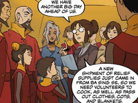 After her wedding day, Zhu Li committed to aiding the many refugees that had been left homeless following the destruction caused by the Earth Empire's invasion of the United Republic of Nations, taking charge of the temporary refugee camp that formed on the outskirts of Republic City. When a new shipment of relief supplies came from Ba Sing Se, she addressed the Air Nation, asking for volunteers to cook, as well as distribute clothes, cots, and blankets. Turning to Kya, she asked the waterbender to join the camp's healers instead, as they were shorthanded that day. She ended her briefing by reminding everyone that the evacuees had lost everything so that it was imperative to make them feel as comfortable as possible. Thanking the volunteers for their effort, she dismissed them to their assigned positions. When Asami and Korra joined the group, Zhu Li and Asami discussed some of the more practical things the latter could help with, deciding that the evacuees needed new housing developments as soon as possible. Korra suggested showing the housing plans Asami had drawn up to President Raiko, and Zhu Li immediately set up a meeting that afternoon.