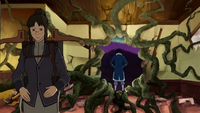 Zhu Li continued to cater to Varrick's every need in the luxurious jail cell they shared. She was ordered to make a pot of green tea when Varrick was visited by Team Avatar.[11] When Republic City later came under attack by the Dark Avatar, Zhu Li was reading a book when she was knocked aside by giant vines that inadvertently destroyed Varrick's cell. She was told to commence operation "Winged Freedom", which entailed her strapping a glider pack to her back and holding onto the businessman, deploying man-made wings to soar away to freedom.[12] Making their way out of the city and into the woods, Zhu Li served as Varrick's mode of transportation, carrying him around on her back. Even after she sprained her ankle, she continued to do so for twenty miles a day.[13]