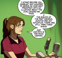 One of President Moon's main challenges was the allocation of the government's limited human and financial resources, at a time when help was needed by both a rebuilding city and its displaced citizens. While she had strong ties to Varrick Global Industries and other companies, Zhu Li preferred not to risk making herself appear too pro-corporation and put the city even further into debt to those companies. With Mayor Ailani — an outspoken critic of corporate influence on government — beginning to spread distrust for President Moon's administration, Zhu Li took comfort in her closest allies and developed a particular interest in altruistic companions with skills and goals aligned with her own humanitarian projects. However, she still tended to clash with Ailani whenever public support is at stake, as the mayor was always in favor of the most popular option, even when Zhu Li was convinced that it will do more harm than good.[24]
