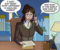 Shortly after Zhu Li heard that Guan had won the election in Gaoling, Korra called her from Zaofu. The president asked the Avatar what happened, and why Wu moved up the date of the election. Korra told her that Guan developed new brainwashing technology and used it on Wu, along with many others. Zhu Li was shocked, and Korra told her that Baatar Jr. has successfully found out how to counteract the brainwashing, but asked the president for backup to face Guan. Zhu Li immediately denied Korra, telling her that there might be even more chaos if the word should get out that the Earth King has been compromised. She told Korra that she would speak with Su and other world leaders about their options, and ordered for Kuvira to be brought back to Republic City, having proven herself as more of a hindrance than a help.