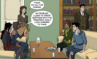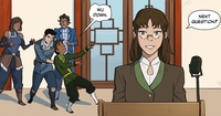 At some point after 174 AG, Zhu Li had to deal with controversy surrounding the Utilities Commission. A businessman, San Ho, and his lawyers persuaded the Utilities Commission to review Wakkanai's rights to Republic City's water treatment facilities. Zhu Li's preference was for Wakkanai to keep her rights instead of handing them to an unknown like San Ho, but she knew that she could only do so much without overstepping the bounds of her presidential authority.[27] Around the time of the debate, she was present at the Pro-bending Arena for the Spring Pro-bending Tournament, sitting in the Presidential Box. She was aware that Varrick was stepping away to deal with an issue, but he did not return, and she was deeply worried. She couldn't easily explain her concerns or provide evidence for them, and she didn't want to spend significant favors or political capital on the search, as the Republic City Police no longer took Varrick's short-term disappearances seriously. She chose to contact a small group of people she trusted to resolve the issue, reaching out to Enuk, Changunak, Zhu Song, Slate, and Pianchir Jing. Zhu Li left her executive secretary Sho Lin to inform the group of the situation at hand, while she returned to her work, as she had to deal with the various political powers and agents of Republic City.[27][28]